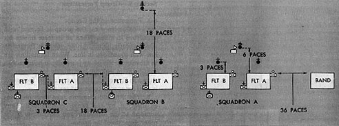 Command Squadron, Right, FACE. Give time for the flight commanders and guidon bearers to position in column formation. Forward, MARCH. (since units are not in mass formation, the column of flights command is not used here). These commands are called from the rightmost squadron to the leftmost squadron. The second squadron does not start until after the first squadron calls the command. |
