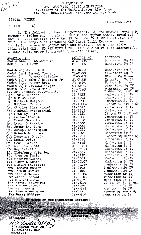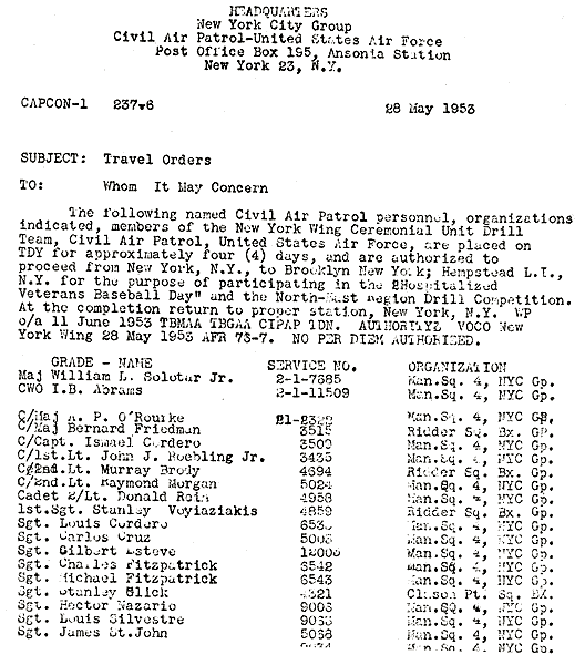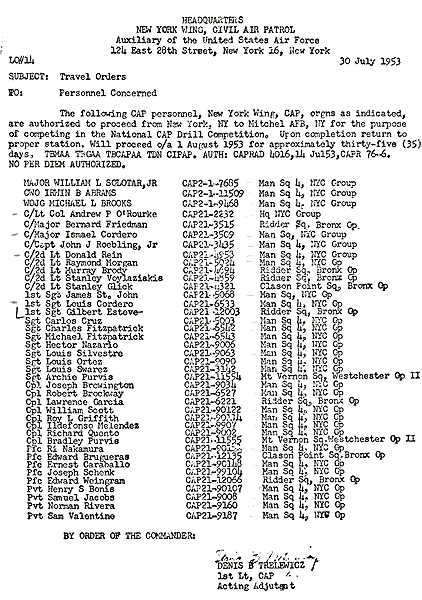 The 1953 Drill team from Manhattan group won NY Wing's third National Championship that year. Included here are rosters from the CAP Drill Team Encampment, Northeast Region Competition and National Competition, all held in NY state that year! Several of these team members were reunited in 1982 for a dinner, organized by Robert King.