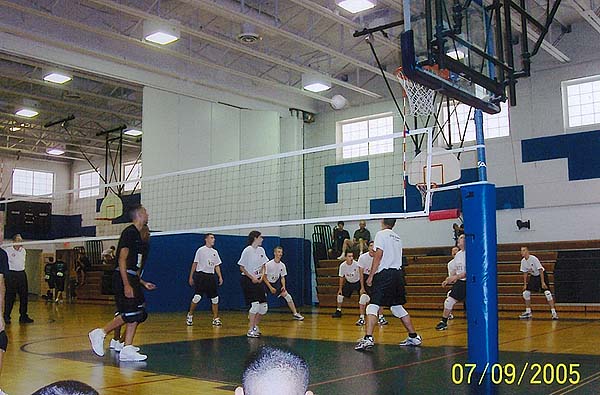 Demon drill team taking down their opponent in volleyball.