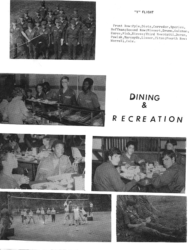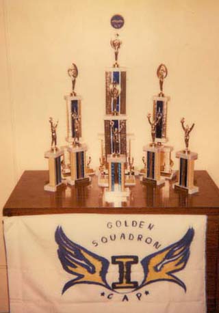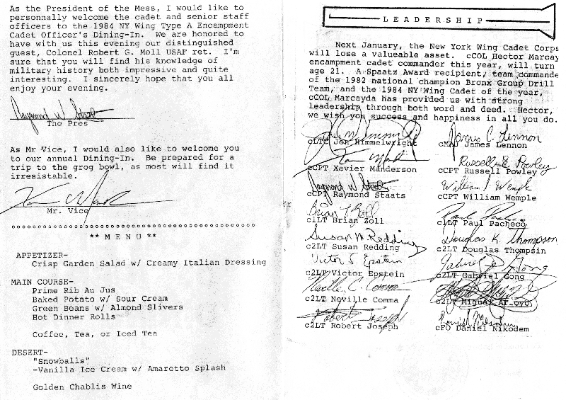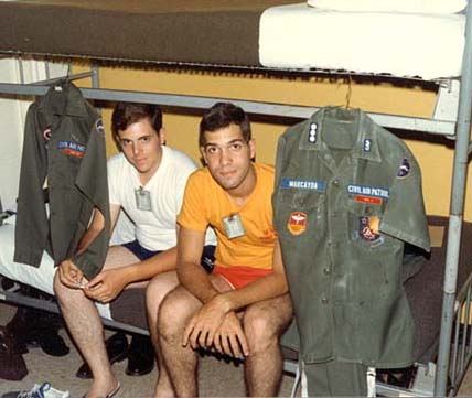 Note the ID card on Cadet Himmelwright's shirt. These ID cards were issued to staff identifying which barracks areas and what times they were authorized to enter. The cadet CQ on duty would examine this and allow or disallow entry based on the ID. The practice of ID card issuance was continued at PAFB encampment until 1991.Awards won by Squadron 1 at the encampment this year. Includes honor flight, honor squadron and Project X awards. The Squadron 1 "Golden" Guidon, being held by C/A Frank Chiarella. Click here to look at the guidons from squadron 1 that year. The squadron 1 flight staff posing outside their barracks area. The squadron 1 staff posing outside their barracks area. Cadets Himmelwright and Marcayda hanging out in the barracks. Cadet 2nd Lt Kowalski, Group Special Services Officer (GSSO) enjoying the fine dining at the encampment. -Commander: C/Capt Peter Sperico