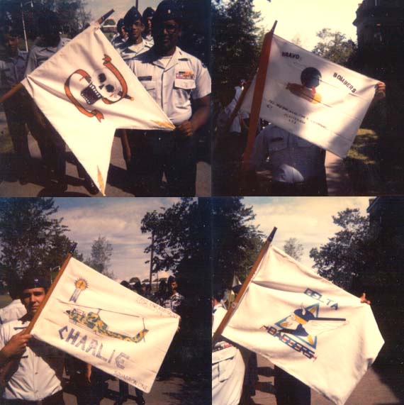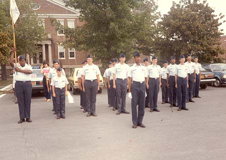 ![]() | India flight marching across parade field. The flight guidon is sticking straight out because the flight is at eyes right. Note the flight sergeant and element leaders are wearing a red tag underneath the ribbons on their left breast pocket. These were nametags identifying their staff position ("position plates"), and were issued at the Plattsburgh encampment up to and including 1991. |