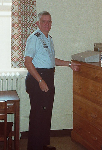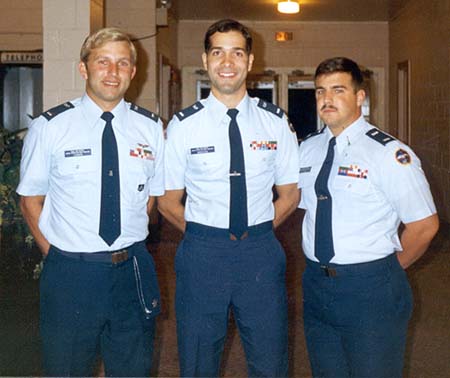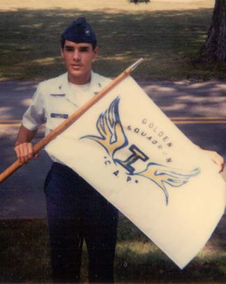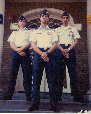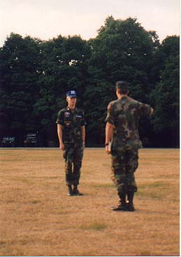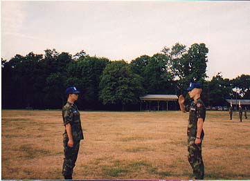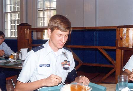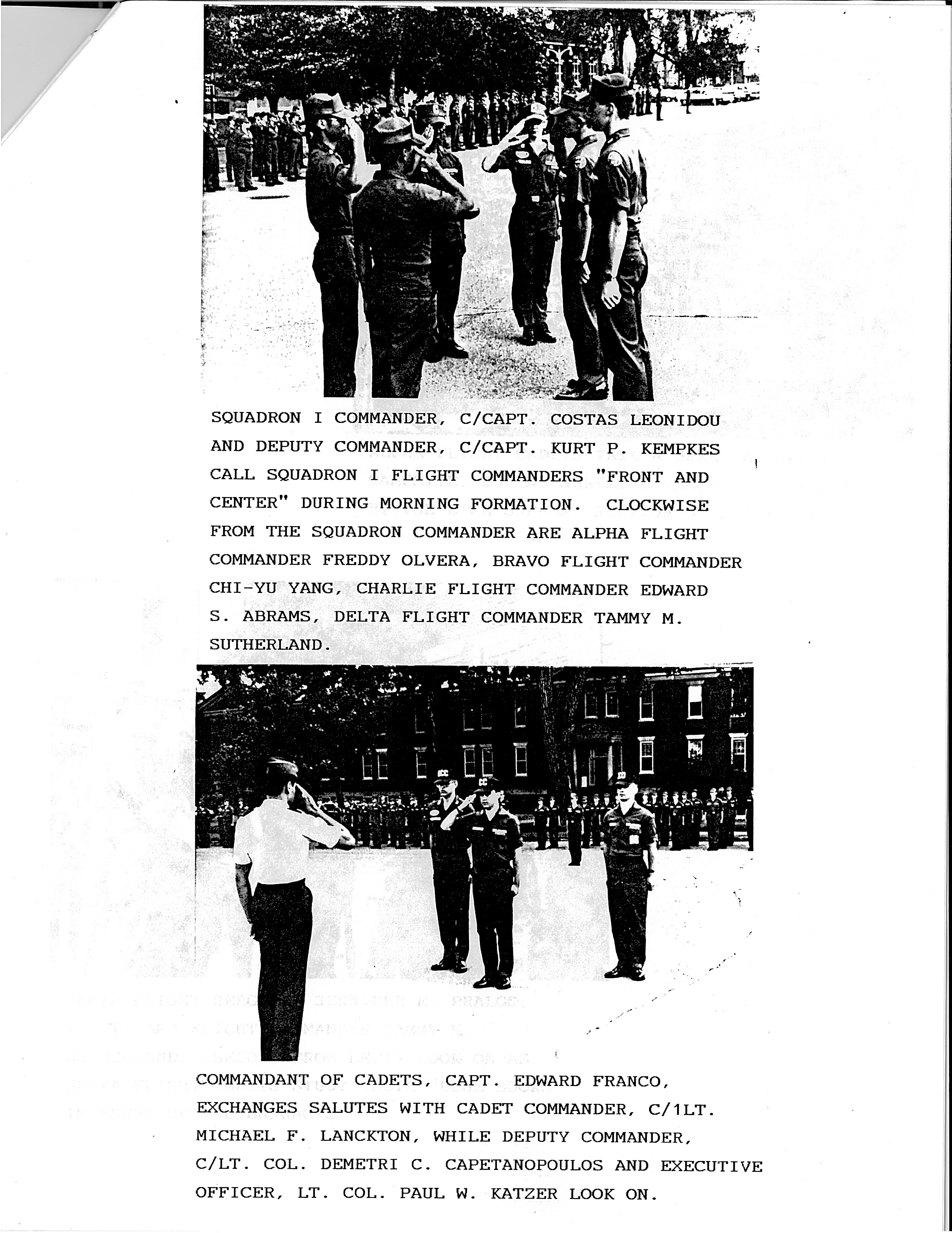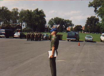 C/Maj Andrew Welsh (member of the Stan/Eval team) performing the daily evaluation of the "54 standard drill commands" of one of the flights in the "famous" parking lot immediately across the street from the barracks. This parking lot is where daily formation and drill practice was conducted. Pre-1991, 'marching tours' were also conducted here for cadets that earned demerits. |