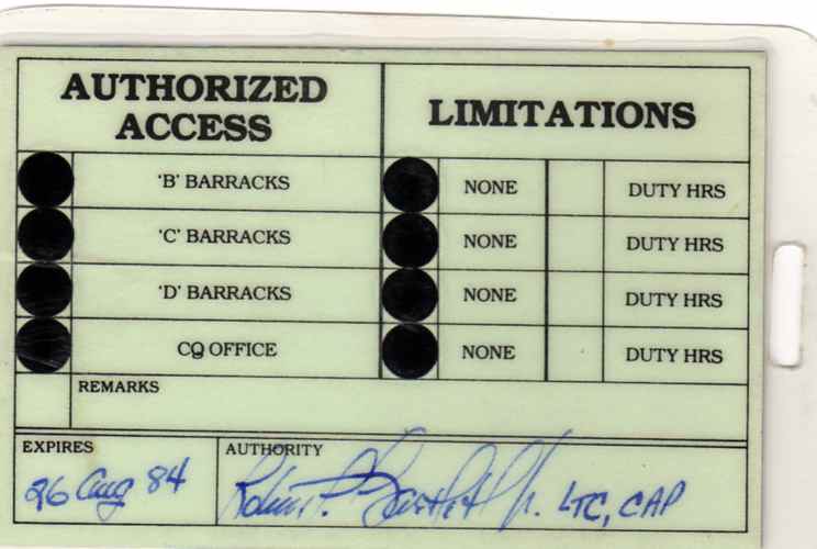 1984 Plattsburgh Encampment Staff Access Pass. Cadet staff were issued barracks access passes during the activity, and cadet CQ's were expected to challenge the staff to determine if their pass permitted them to enter the various sections of the barracks.