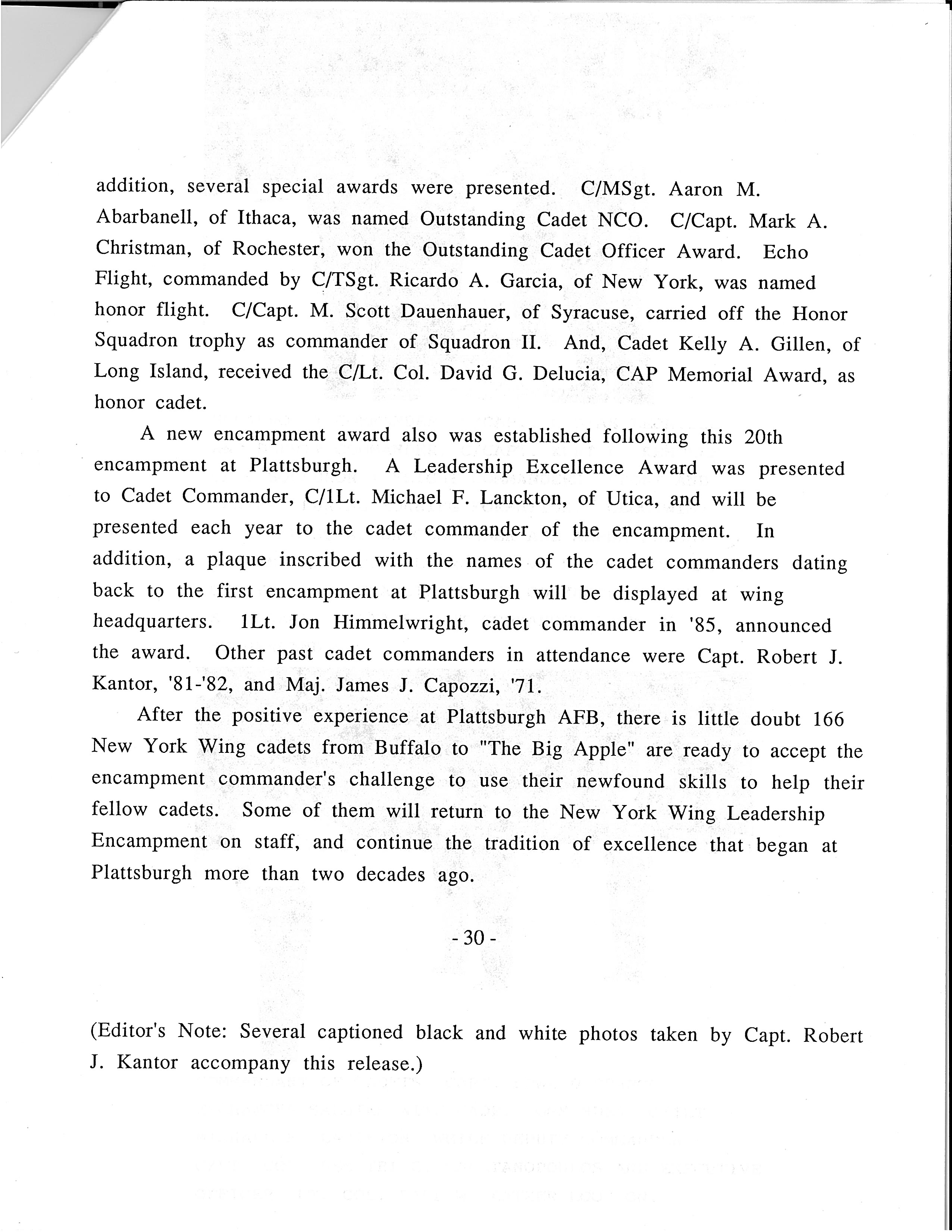 The 1991 Plattsburgh encampment was the second and final encampment commanded by Maj Robert Kantor, a former Spaatz cadet. There were several noteable happenings at this particular encampment. In 1991, CAP-USAF authorized the use of the Battle Dress Uniform, beginning the phase-out of the olive drab fatigue uniform. The encampment was mix-and-match when utility uniforms were worn.