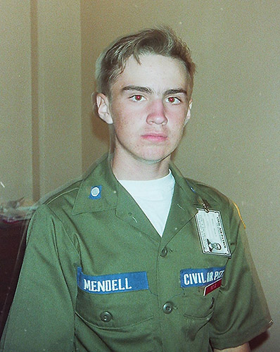 Cadet 2nd Lt Mendel has a position plate and barracks access pass on his fatigue uniform shirt. |