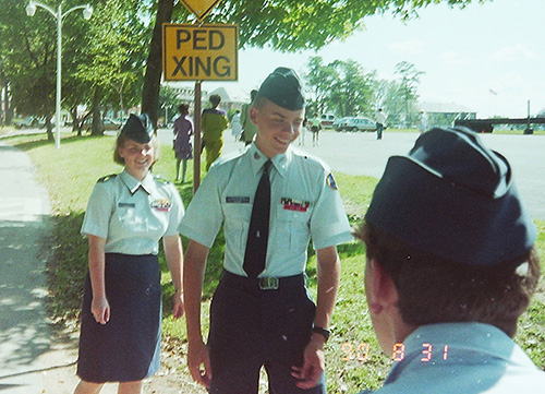 Echo flight from 1995 standing in single file ready to go somewhere. The cadet adjusting his hat is Brian Lenhardt, and the cadet with the camera is Emily Genser. |