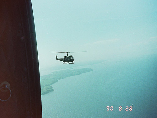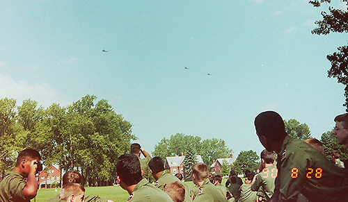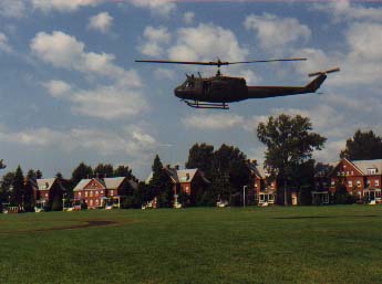 Heuey UH-1 landing on the parade field when arriving to give the encampment orientation rides. This was before the safety briefing. The cadets found out about the rides with the helicopters landing on the pad-- the cadet staff intentionally did not tell them about this. |