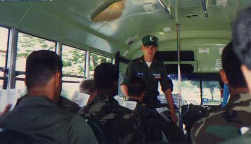 C/FO Andrew Welsh (E Flight Sergeant) aboard the bus on its way to some tour or activity, with the cadets in flight "reading their blue books"-- a small handbook filled with the standard operating procedures and items for memorization by cadets, called a "blue book" because of it's blue cover. Although not utilized as much in 1991 as in the past, flight staff often had cadets "read their blue books" to fill the time-- while waiting for chow or on the bus. |