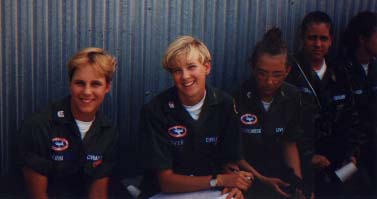 From Left to Right: Cadet Emily Sediva (Hotel flight CC, female flight), Cadet Tracy Figler (Hotel Flight sergeant, female flight), <don't know>, and also looking at the camera- Cadet Christina Barbato (who later became Cadet Commander at the Fort Drum encampment in 1996). This was at the flight line for the static AV-8A Harrier display. |