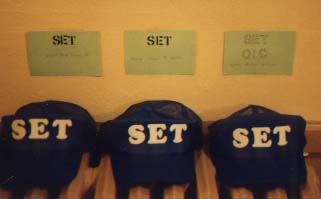 At the entrance to each bay of the barracks were two radiators. These radiators were perfectly suited for use as "parking spots" for staff cadet's hats-- one of those unwritten practices/traditions followed by cadet staffs since the colored staff hats were introduced in 1987/88. The Stan/Eval team (SET) wore blue hats-- the same color as the cadet command staff, since SET was performing a command function (inspections). This was the last year SET wore blue hats at a NYWG encampment. The SET team "reserved" their parking spots with the placards above the radiator in the staff office entrance. |