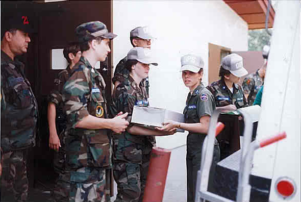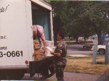 C/FO Kurt Paeper (Mess Ops OIC) unloads food supplies from truck behind mess hall. |