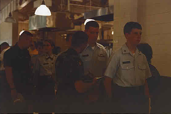 Around table starting from left to right in back row: Cadet Arias (with shoulder boards), Cadet Himmelwright (holding notebook, this cadet later became cadet commander in 1985), Cadet Lennon, Cadet Grey and Cadet Staats. Squadron 1 staff enjoying a meal in Plattsburgh's barracks basement chow hall.