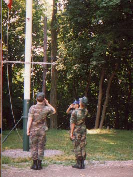 Once, the cadet color guard somehow lowered the flag halyards (hooks) reversed (as if they had gone over the top of the pole). The result, after the flag was raised, was the flag being stuck on the top of the pole! After the National Anthem was long over, the encampment patiently standing at present arms, the cadets finally gave up. The flag was stuck up there until the following afternoon when it was pulled loose and lowered.